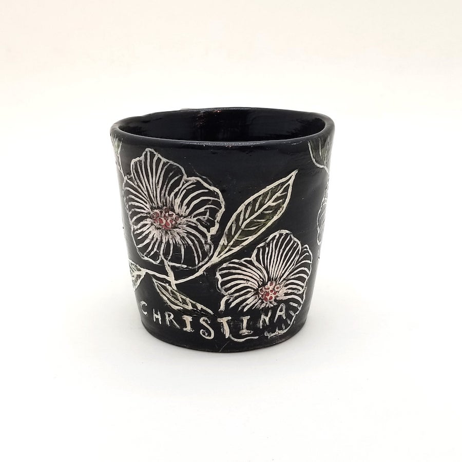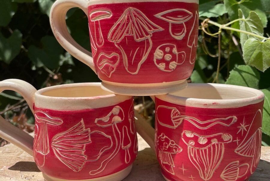 Sgraffito is an Italian word that means “to scratch.” It is a technique for decorating pottery that involves applying layers of color or colors (underglazes or colored slips) to leather hard pottery and then scratching off parts of the layer(s) to reveal the clay color underneath and create contrasting images, patterns, and texture.